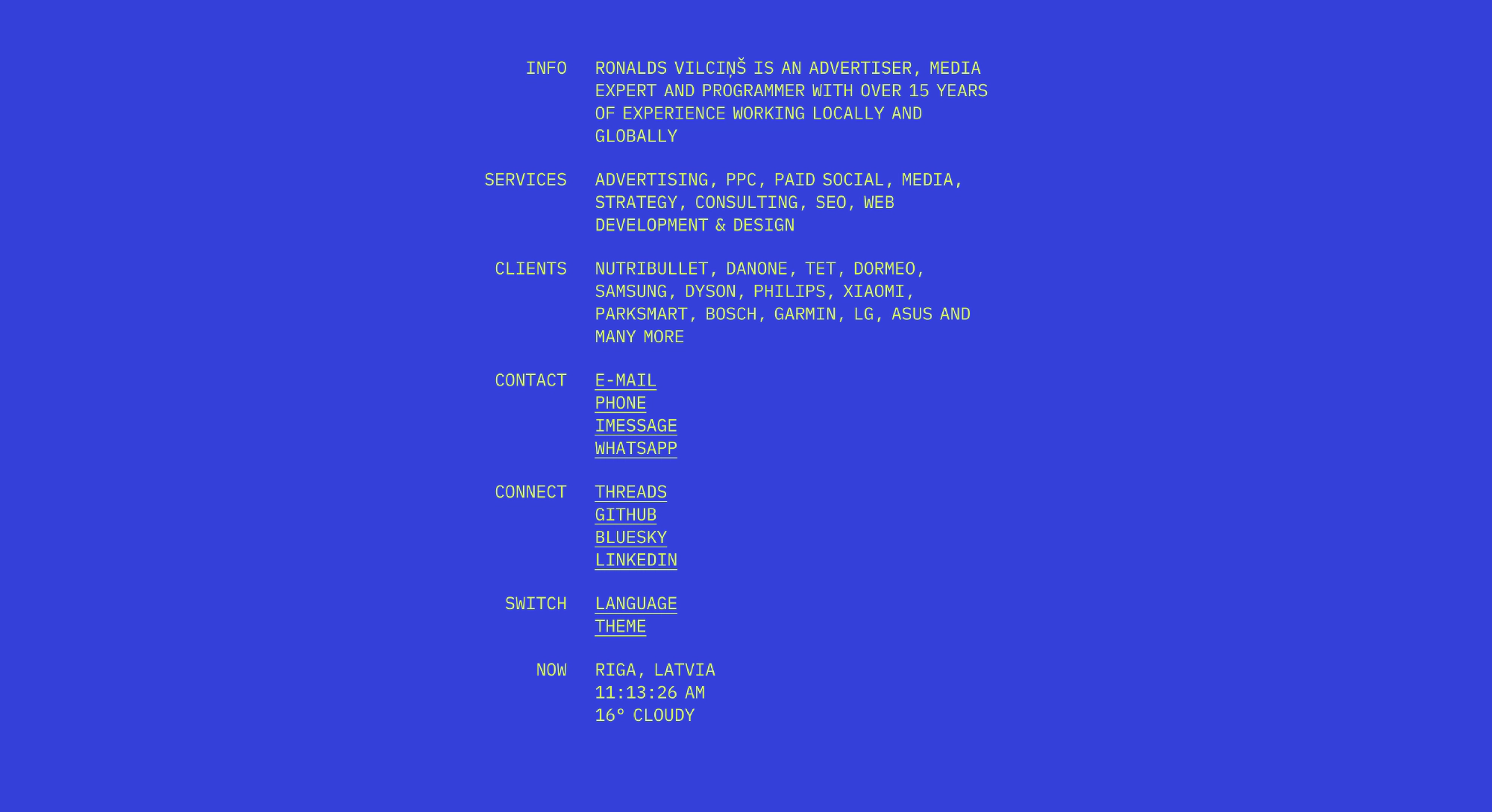 About Ronalds Vilciņš is an advertiser, media expert and programmer with over 15 years of experience working locally and globally.